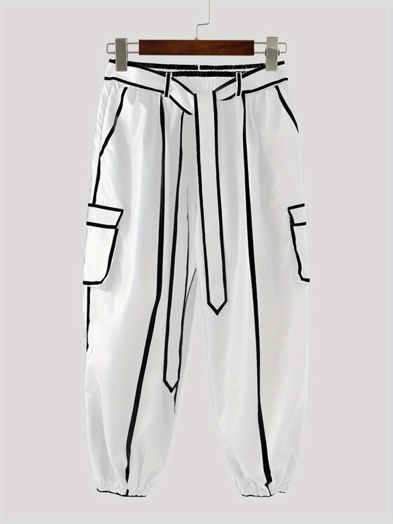 Guy & Dia INCERUN Men'S Streetwear Pants - Elastic Waist Lace-Up Baggy Trousers with Adjustable Drawstring, Lightweight Non-Stretch Fabric, White & Black Color Block Design for Urban Fashion, Concerts, Festivals - Casual Outfit Essentials, Concert Attire