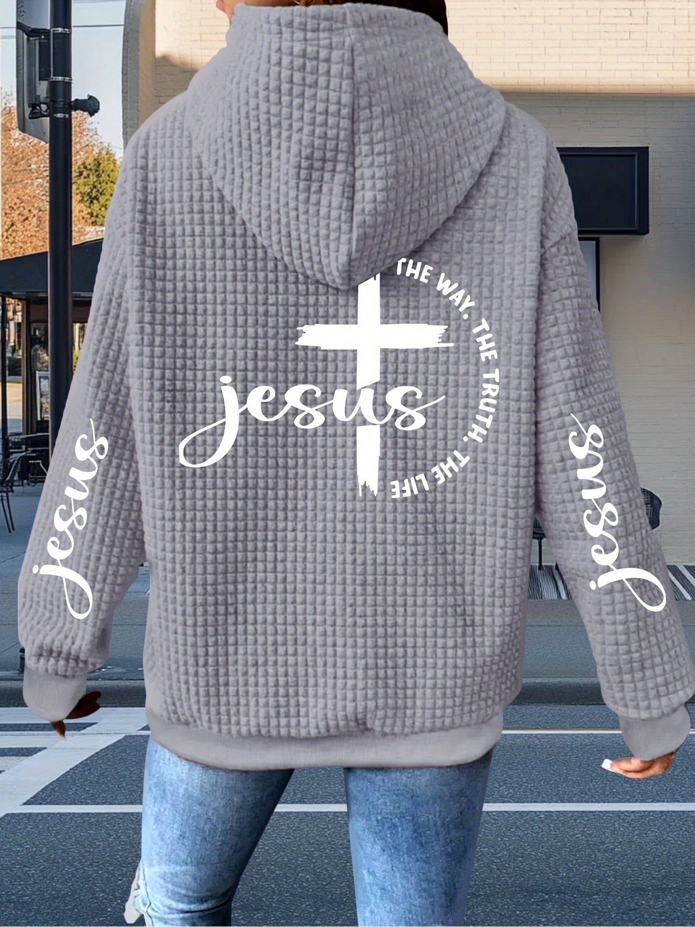 Guy & Dia Women's Zip-Up Hoodie - Black with White Lettering, Full-Zip Closure Hooded Sweatshirt, Machine Washable Polyester Pullover for Everyday & Formal Outfits - Christian Apparel, Religious Clothing, Casual Wear, Geometric Print, Comfo